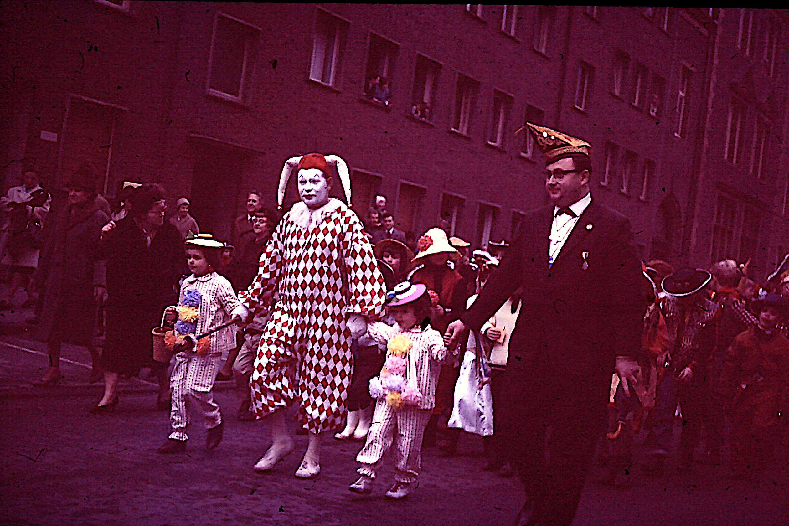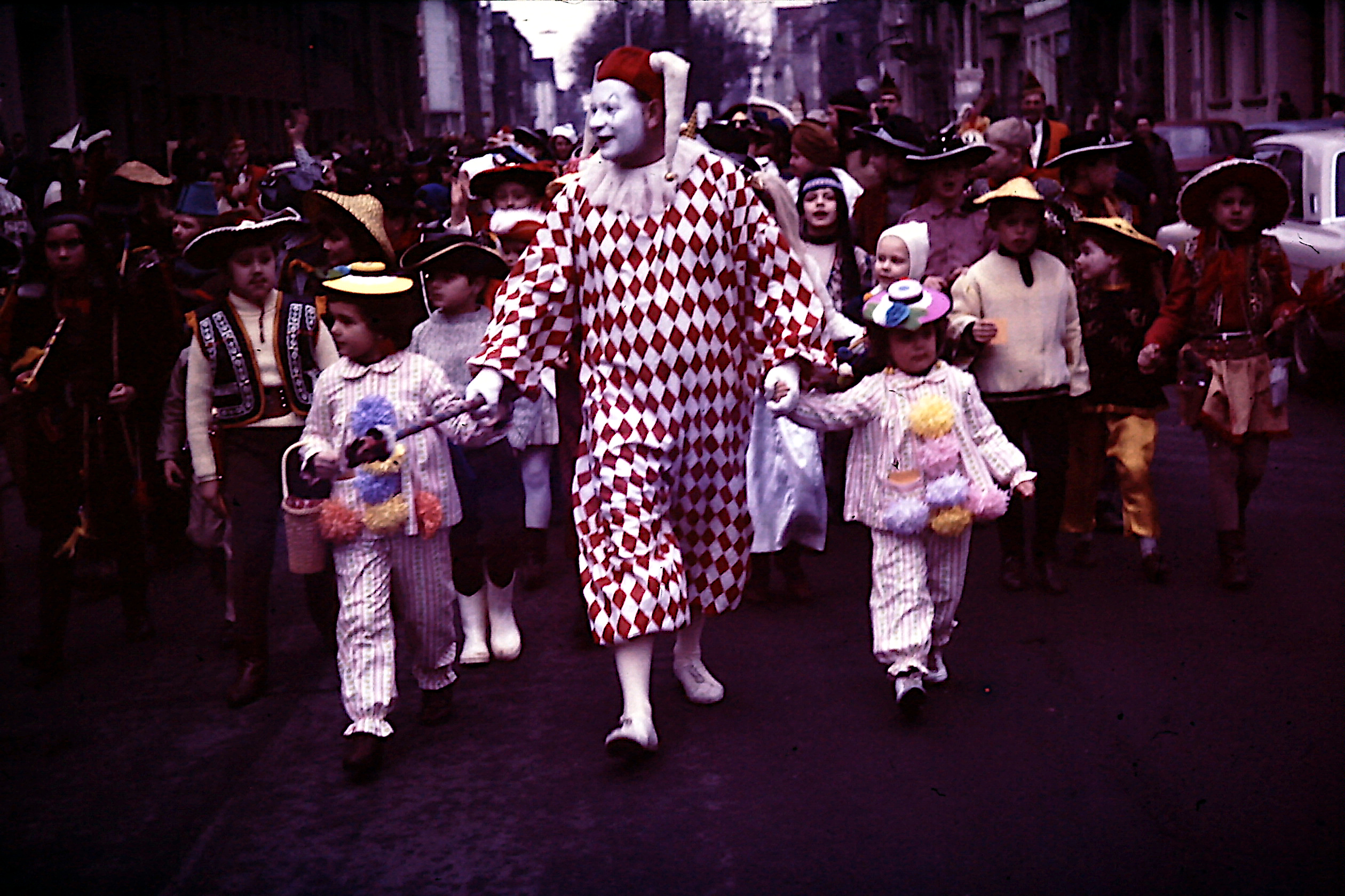 Als wir uns am Straßenrand aufgestellt hatten, bekamen wir „Besuch“ – der Hoppeditz wollte mit uns beiden Mädchen den Karnevalsumzug anführen! Er rief meiner Mutter noch kurz zu, wo sie uns später wieder abholen kann und dann ging es auch schon los. Wir waren so aufgeregt und unfassbar stolz, daß wir mit dem Hoppeditz ganz vorne gehen durften. Teilweise ging auch der damalige Bürgermeister mit und nahm mich an die Hand – was für ein Erlebnis!